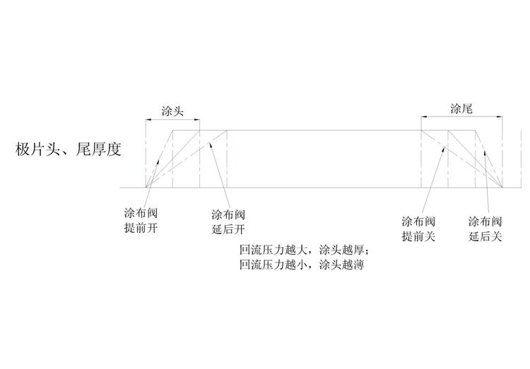 上圖情況是因?yàn)榍惑w壓力和回流壓力壓差太大,跳間隙料回流多了導(dǎo)致腔體壓力小,再啟涂時(shí)涂頭就薄了,解決方法:①關(guān)小些回流閥門讓涂布時(shí)腔體壓力與回流瞬間腔體壓力相持平或小于0.2就能保證頭部面密度與中間面密度一致的。